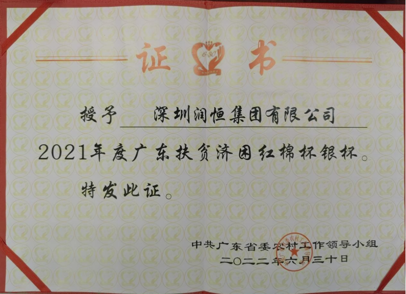 在2021年,上一屆“廣東扶貧濟(jì)困日”活動(dòng)上,深圳潤(rùn)恒集團(tuán)有限公司榮獲2020年度廣東扶貧濟(jì)困紅棉杯金杯。